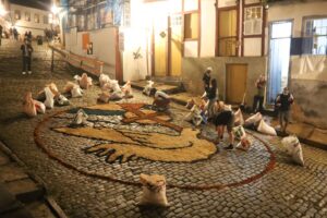 Os tapetes retratam cenas bíblicas, símbolos sagrados e mensagens de paz e esperança, criando um cenário único e emocionante que antecede a Procissão da Ressurreição.