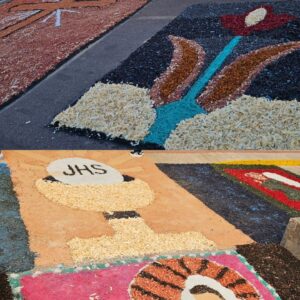 Desde as primeiras horas do dia, moradores e devotos se uniram para elaborar os tapetes, utilizando materiais como serragem tingida, pó de café, areia, cascas de ovos, flores e outros elementos naturais.